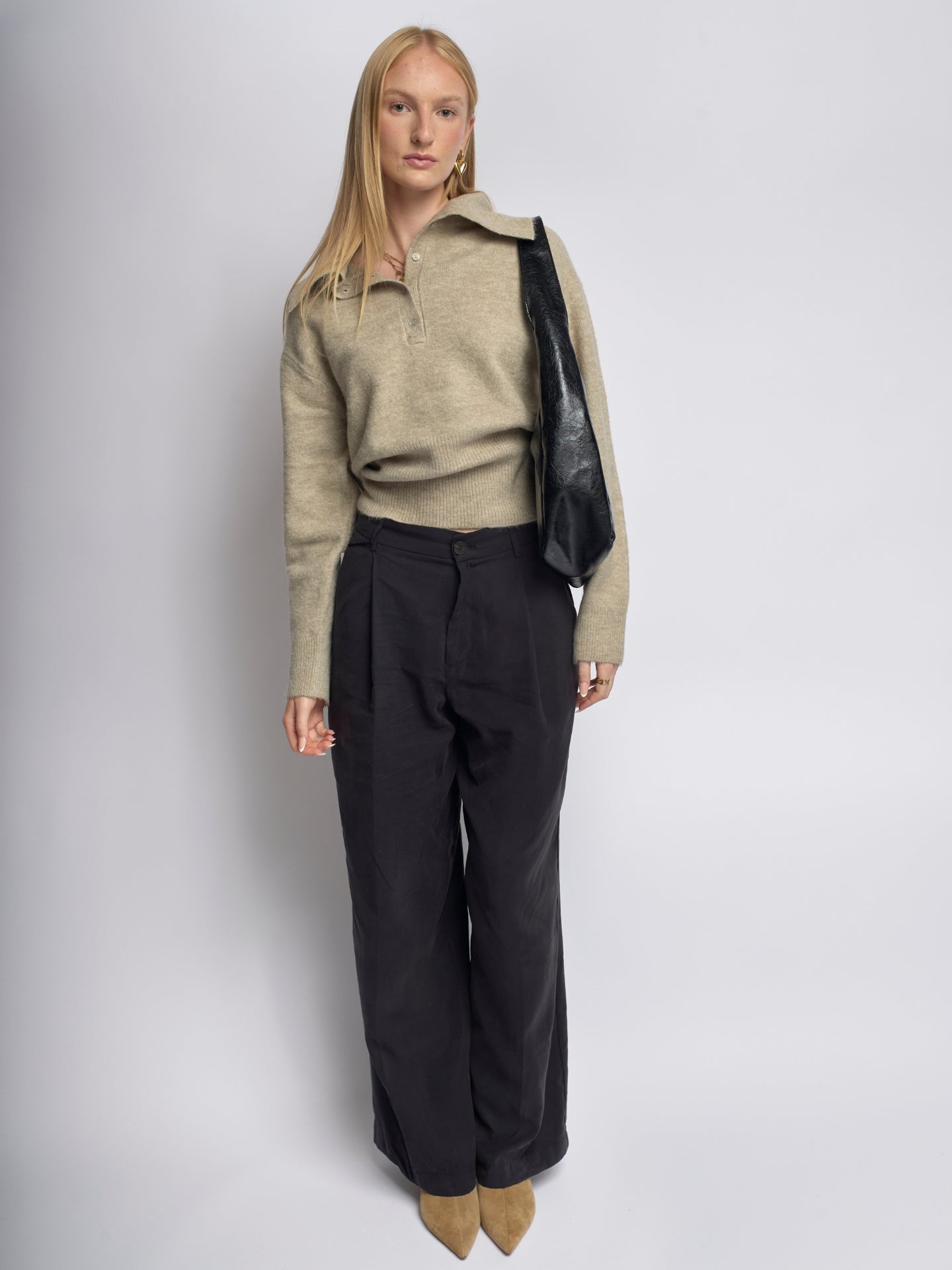 Your new everyday bag: a shoulder bag with a structured shape and a shiny finish. It features a spacious main compartment secured with a button closure, two small zippered inner pockets, and an open pocket for easy organization. Designed to fit a 13-inch MacBook, this bag is crafted from durable vegan leather.